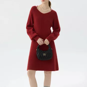 Elegant Red V-Neck Knitted Dress for Women – A-Line Long Sleeve Dress