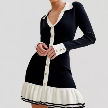 Elegant Retro Lapel Metal Buckle Knitted Slim Party Dress for Women