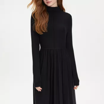 Women’s Black Knitted Sweater Dress – Mock Neck, Pleated, Fit and Flare