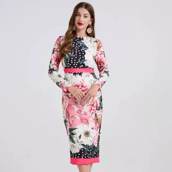 Elegant Silk Satin Waist-Slimming Printed Dress with Belt & Knee-Length Skirt