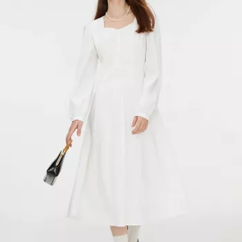 Women’s White Long Sleeve Square Neck High Waist Cotton Dress