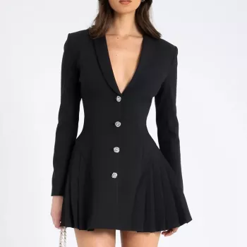 Chic Black Blazer Mini Dress for Women – Stylish V-Neck Pleated Dress