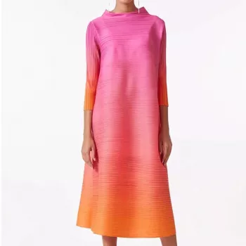 Elegant Gradient Pleated Mid-Calf Turtleneck Dress with Full Sleeves